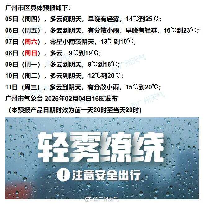广州方面,未来几天云量较多,湿度增加,有轻雾和分散小雨。新一股冷空气周末到,厚衣服先别收。