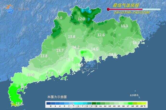 6日,粤北市县阴天,有小雨,其余市县多云到阴天,有分散小雨,大部分市县早晨有轻雾或雾,傍晚到夜间气温自北向南逐渐下降。早晨最低气温:粤北和珠三角北部市县12℃~15℃,南部沿海和珠三角中南部市县18℃~21℃,其余市县15℃~17℃。