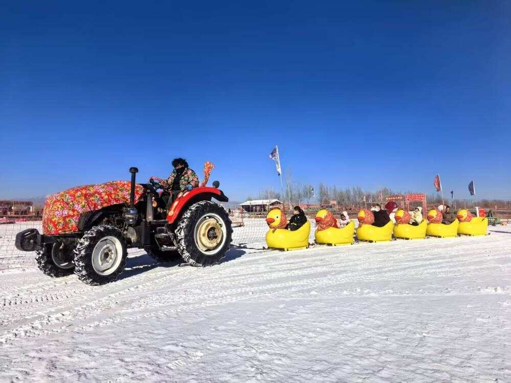 稻渔空间乡村生态观光园里,稻田褪去金黄,化身冰雪乐园。游客坐着雪圈从人造雪坡顶俯冲而下,雪地摩托呼啸驰过,尖叫声、欢笑声此起彼伏。