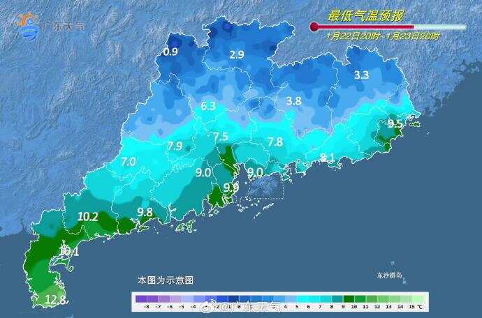 @广东天气预计,23日早晨,粤北市县有大范围5℃以下的低温天气,高海拔山区-4~0℃,有冰(霜)冻,局部有冻雨或雨夹雪;23白天-24日广东省多云到晴天,早晨有轻雾局部有雾,昼夜温差大;25日,大部市县阴天,有小雨或雾。
