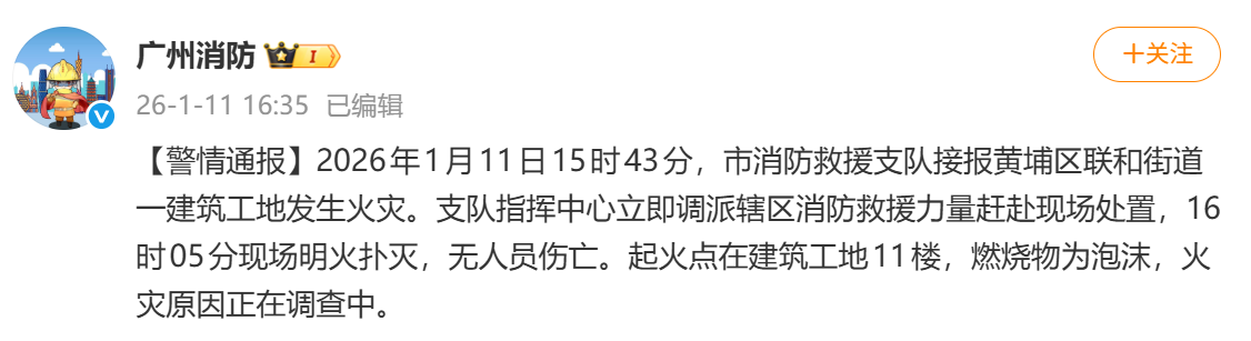@广州消防 下午发布警情通报:2026年1月11日15时43分,市消防救援支队接报黄埔区联和街道一建筑工地发生火灾。支队指挥中心立即调派辖区消防救援力量赶赴现场处置,16时05分现场明火扑灭,无人员伤亡。起火点在建筑工地11楼,燃烧物为泡沫,火灾原因正在调查中。