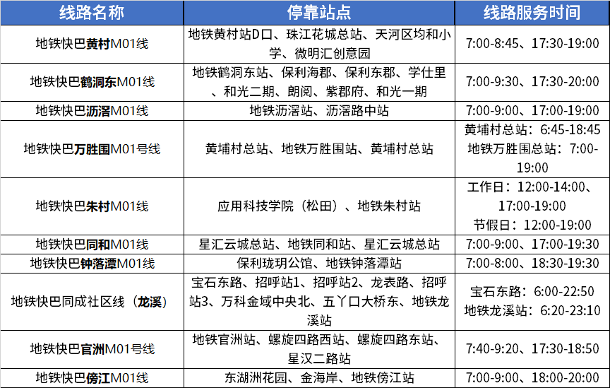 “地铁快巴”首批10条示范线重点覆盖鹤洞东、沥滘、黄村、万胜围、朱村、同和、钟落潭、龙溪、官洲、傍江等地铁站,接驳周边产业园区、学校及大型社区。