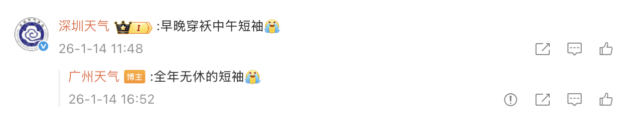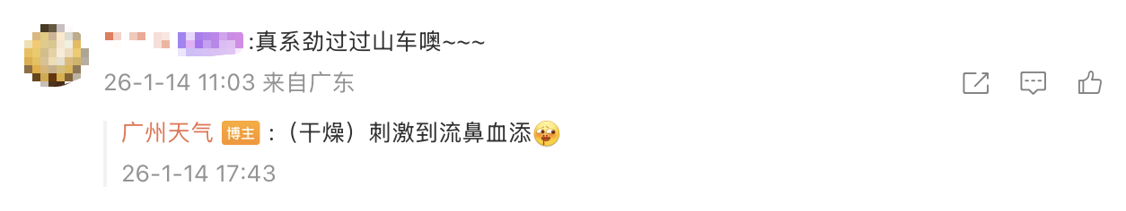 广州方面,这几天虽然天气很平稳,但温度却在上演大起大落的剧情,昼夜温差较大。有网友表示:一天经历四季的广州人好忙;穿衣服都要确保每一层都方便见人。
