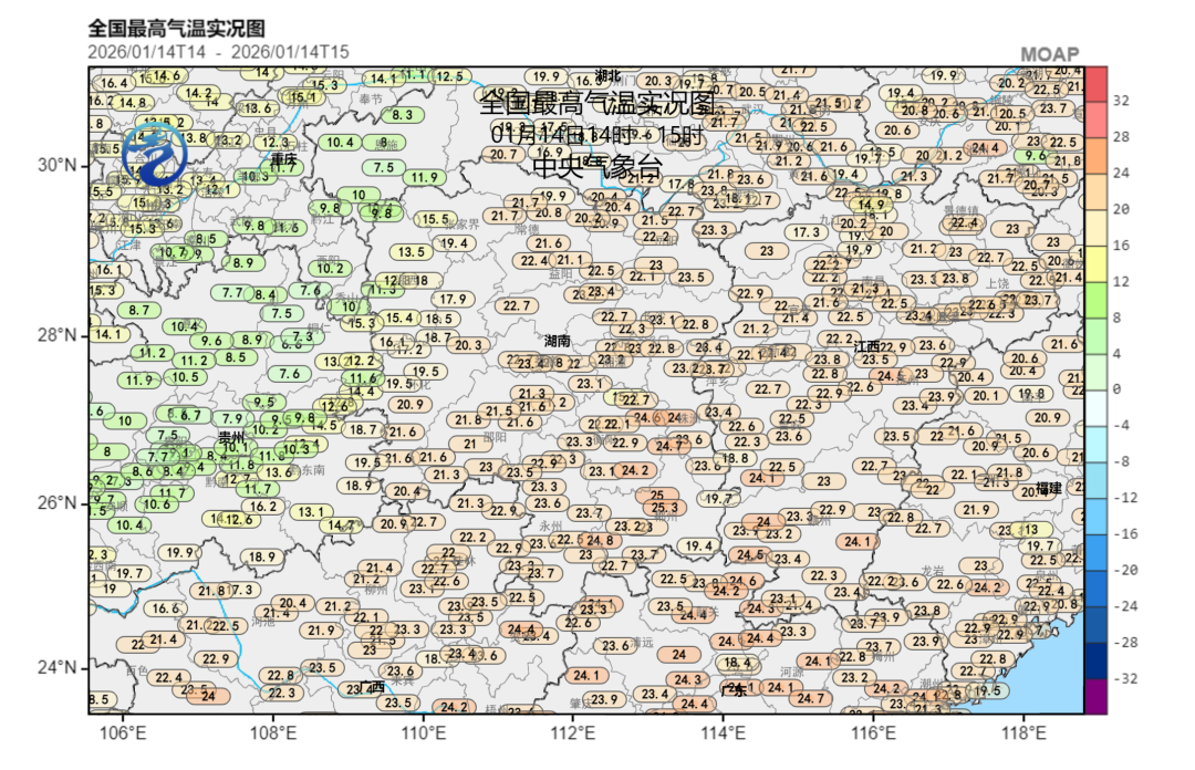 14日白天,我国出现大范围回暖。特别是黄淮到江南地区,预计今明两天白天温暖程度将远超常年同期,气温会陆续达到本轮升温的高点,长江以南最高气温大多超过20°C,多地比常年同期偏高10℃以上。