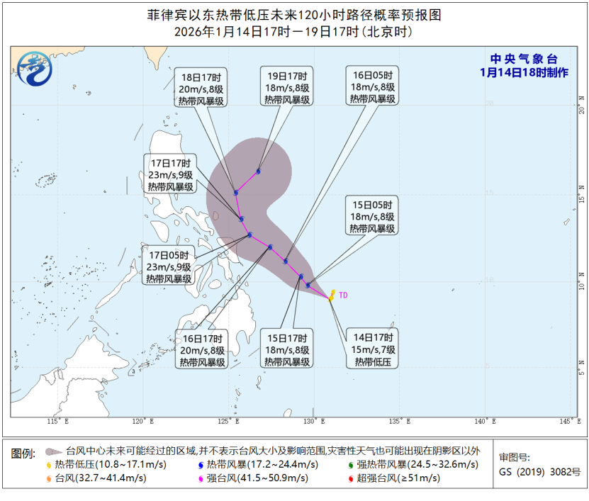 菲律宾以东洋面热带低压的中心14日下午5点钟位于菲律宾马尼拉东偏南方向约1250公里。预计,该低压将以每小时15公里左右的速度向西北方向移动,强度逐渐增强,可能于未来24小时内加强为今年第1号台风,最强可达热带风暴级(18-23米/秒,8-9级),对广东省海面无直接影响。