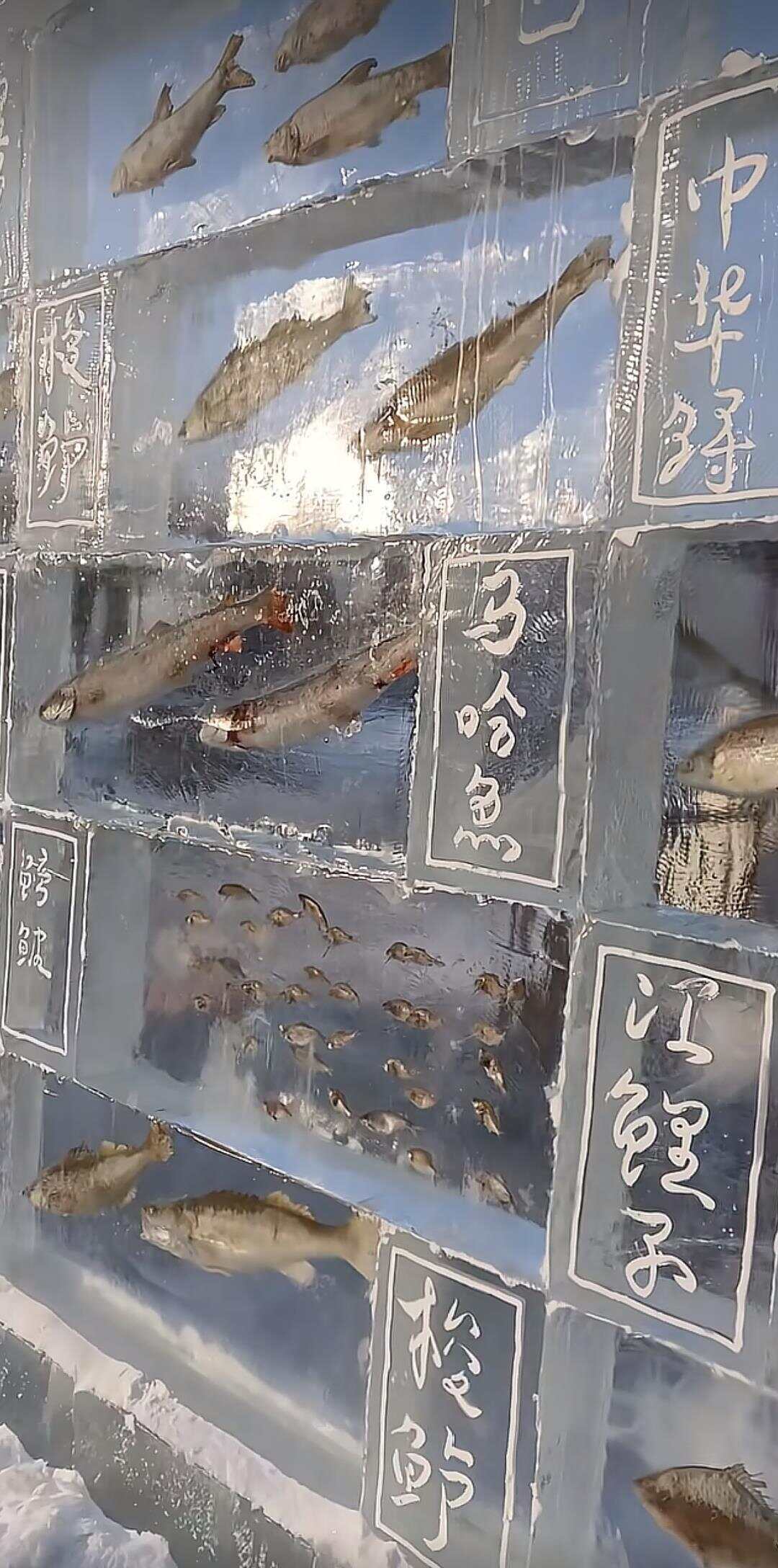 来自黑龙江同江市的王先生告诉极目新闻记者,12月30日,他在同江市三江口生态旅游区游玩时,发现江边一处空地上有一面冰墙景观,墙壁内冻着不同品种的鱼类,一旁还有名字。王先生称,这些鱼类来自黑龙江和松花江,他第一次看到该景观,便随手拍了视频记录。