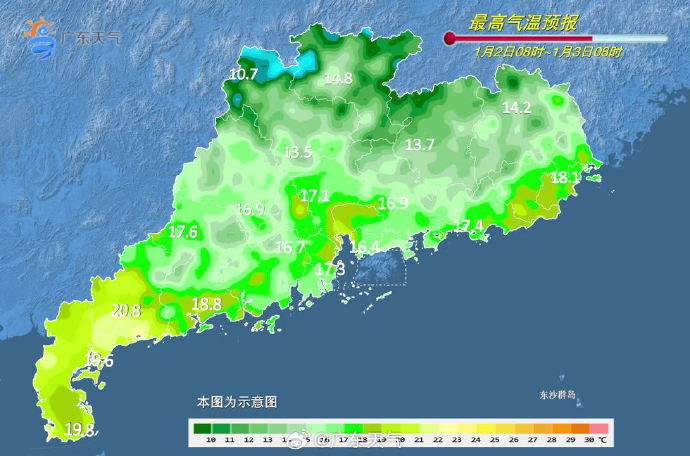 3日-4日,广东全省大部晴间多云,昼夜温差大,早晚寒冷。最低气温:粤北、珠三角北部市县2℃~5℃,其中高海拔山区-4℃~0℃,有霜冻和冰冻,粤西沿海市县10℃~14℃,其余市县6℃~9℃。