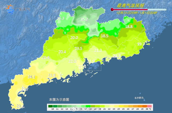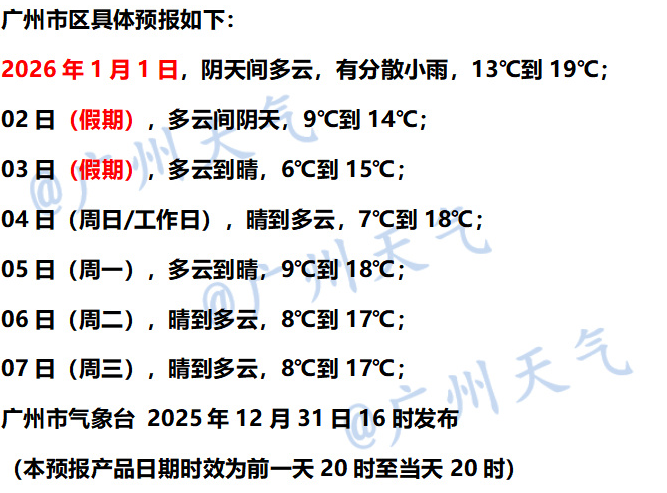@广东天气 预计,受较强冷空气影响,广东元旦假期(1月1-3日)将迎来降温和大风天气,1日阴天有分散小雨,2-3日多云到晴,冷空气前锋于1日早晨开始影响粤北、傍晚前后到达广州、夜间到达南部沿海,中北部市县气温下降7~9℃、南部下降5~7℃,陆地有5~7级阵风,广东海面有6~8级偏北风,阵风8~9级。