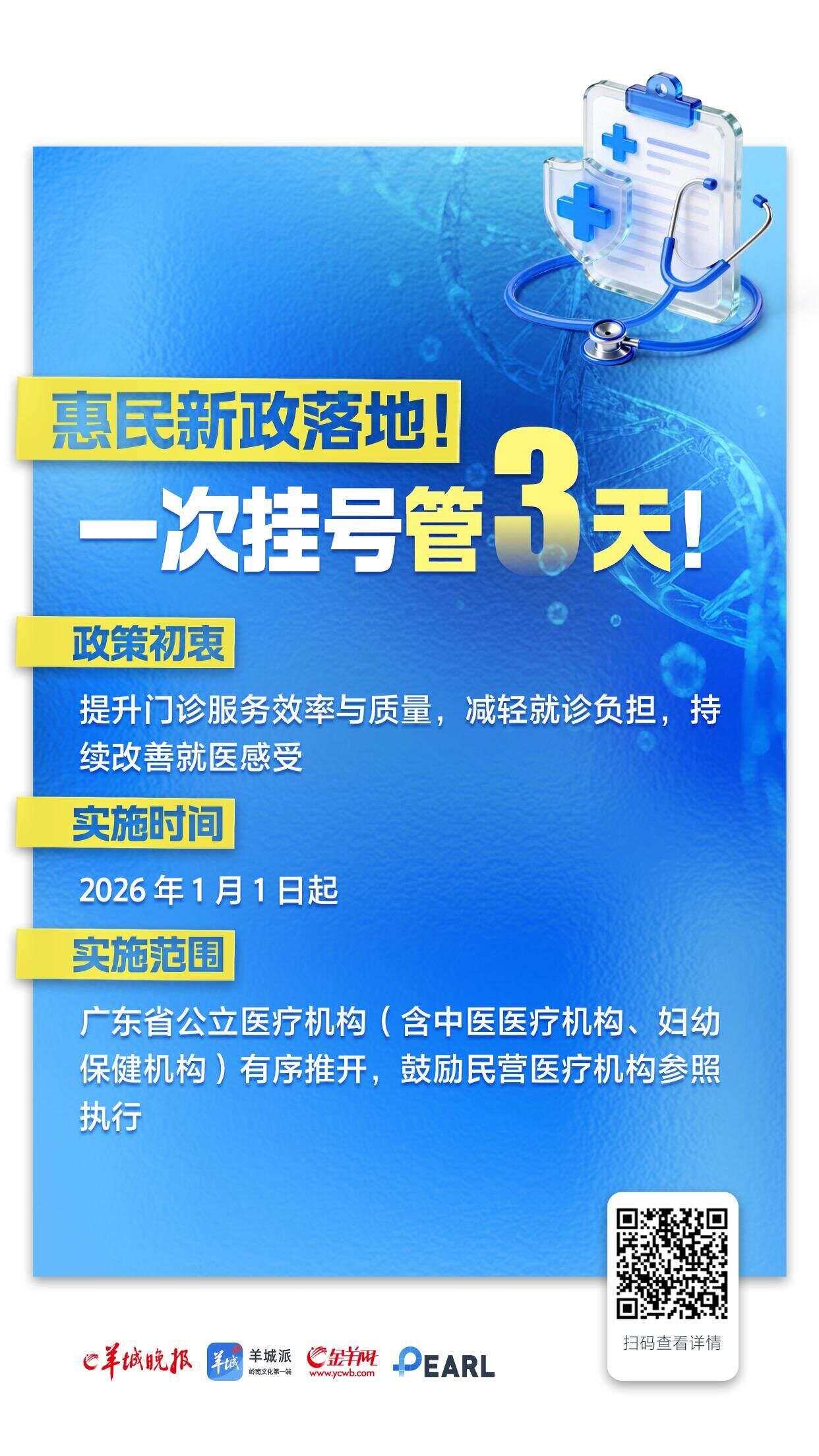 羊城晚报讯 记者张华、朱嘉乐,通讯员粤卫信报道:记者从广东省卫生健康委员会获悉,自2026年1月1日起,广东省公立医疗机构将有序推行普通门诊“一次挂号管三天”惠民便民措施。此举旨在解决患者因检查检验结果未当天出具而需反复挂号的问题,进一步节约群众就医成本,提升就医便利性。