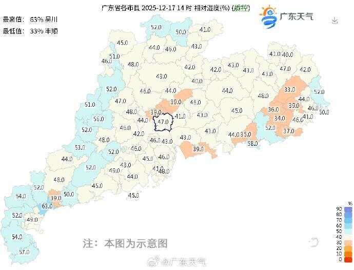 在阳光的加持下,昨日广东省部分市县的相对湿度不足40%。