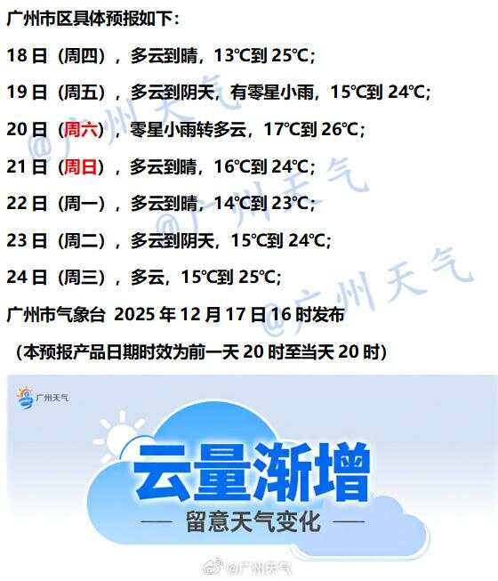 19日,多云到阴天,有零星小雨,15℃到24℃;