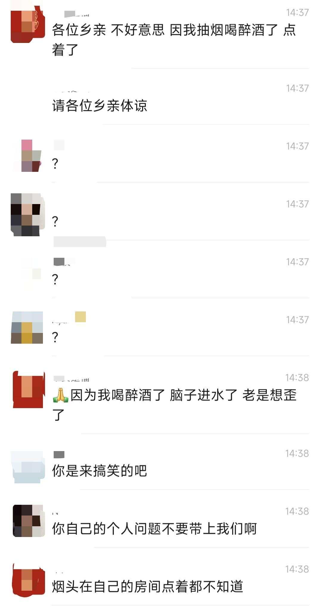 下午2时40分左右,该业主称“各位乡亲,不好意思,因我抽烟喝醉酒了,点着了”“烟头在自己房间点着都不知道”。