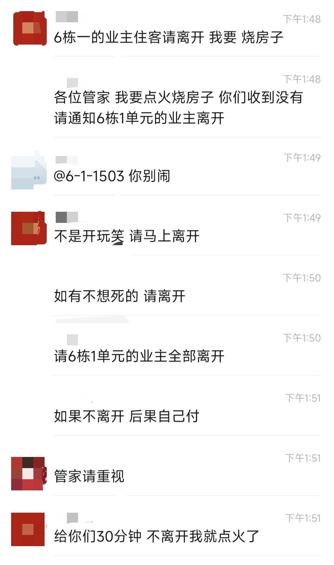 12月18日,网传截图显示,下午1时50分左右,珠海玺悦湾(南区)业主群内有一名业主称自己要“烧房子”,请管家通知6栋1单元的业主离开。不久后,小区内业主发布的图片显示,楼栋已经冒出浓烟。