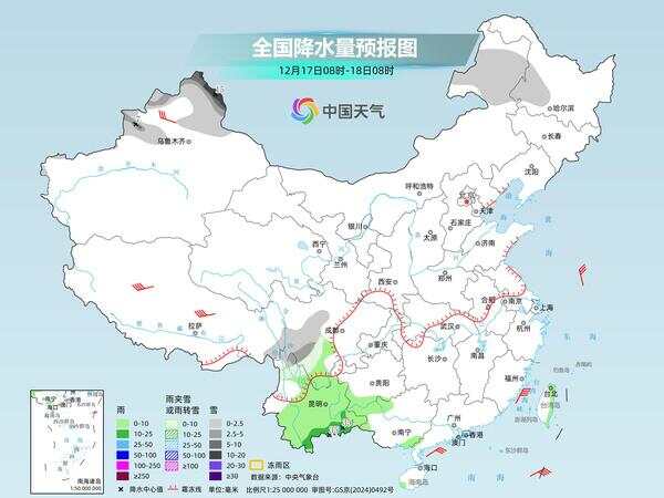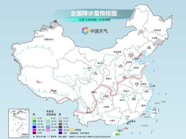 16日之后受南支槽东移影响,西南、华南阴雨天气会有所增多。其中,西南地区南部、广西西北部和东南部等地部分地区有小到中雨,云南东南部局地有大雨。同时,内蒙古东北部、黑龙江西南部、新疆北疆北部、川西高原中南部、云南西北部等地部分地区有小到中雪或雨夹雪。