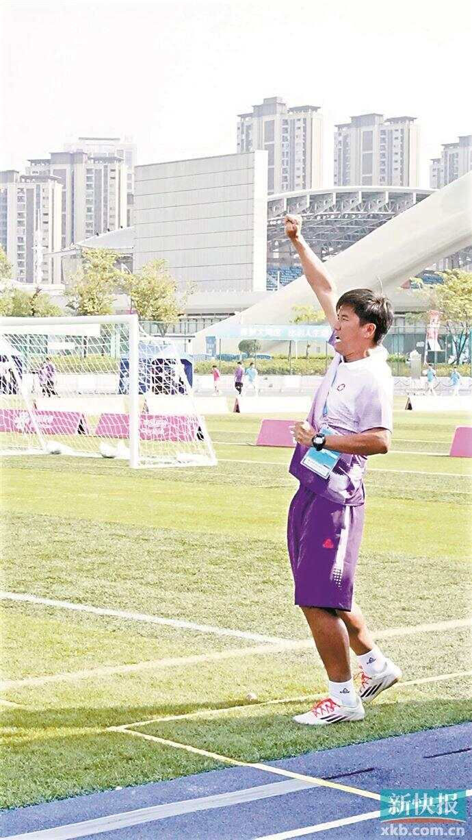 ■香港特奥足球队主教练曾晨聪在赛场边振臂高呼。 金瑜/摄