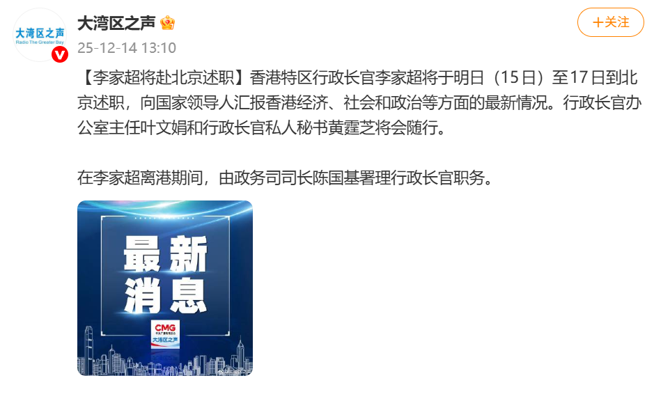 12月14日,据@大湾区之声:香港特区行政长官李家超将于明日(15日)至17日到北京述职,向国家领导人汇报香港经济、社会和政治等方面的最新情况。行政长官办公室主任叶文娟和行政长官私人秘书黄霆芝将会随行。