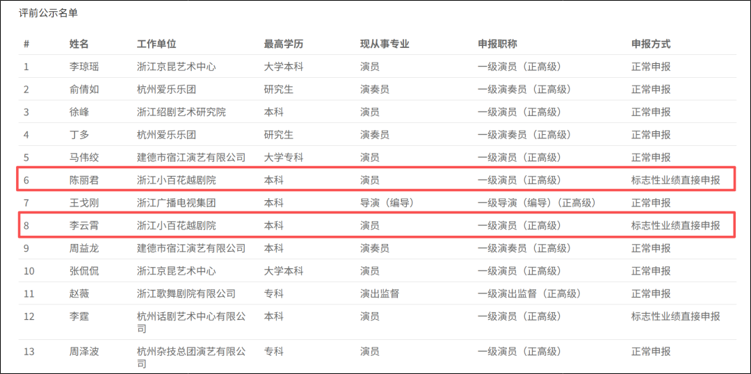 浙江省人社厅网站12月1日发布《2025年度浙江省文化广电和旅游厅艺术系列高级(艺术一级)专业技术职务任职资格评审计划评前公示》,其中,浙江小百花越剧院演员陈丽君、李云霄以标志性业绩直接申报一级演员(正高级)。