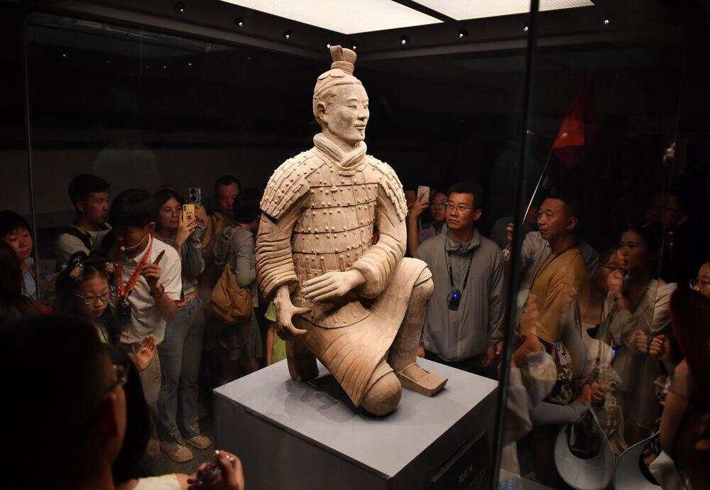 2024年5月17日,游客在陕西秦兵马俑二号坑遗址参观跪射俑。秦始皇陵和兵马俑坑考古发掘至今已逾半个世纪,成为世界认识中华文明的名片。
