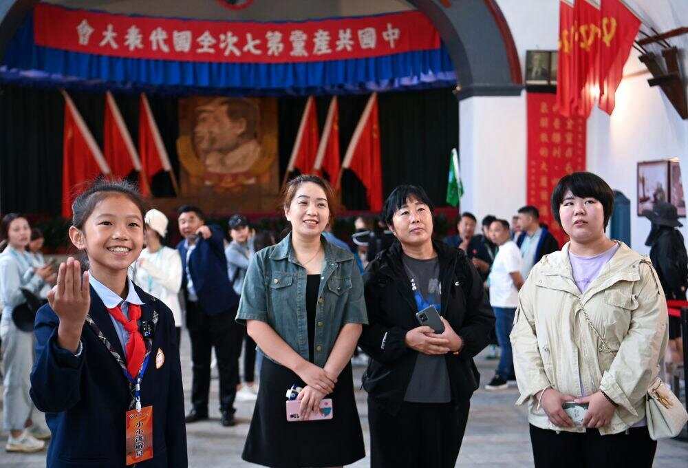 2023年8月29日,陕西延安杨家岭革命旧址的“小小讲解员”贺偲彤(左一)为游客讲解。贺偲彤是延安市宝塔区新新小学的学生,常利用寒暑假时间在杨家岭革命旧址做义务讲解。