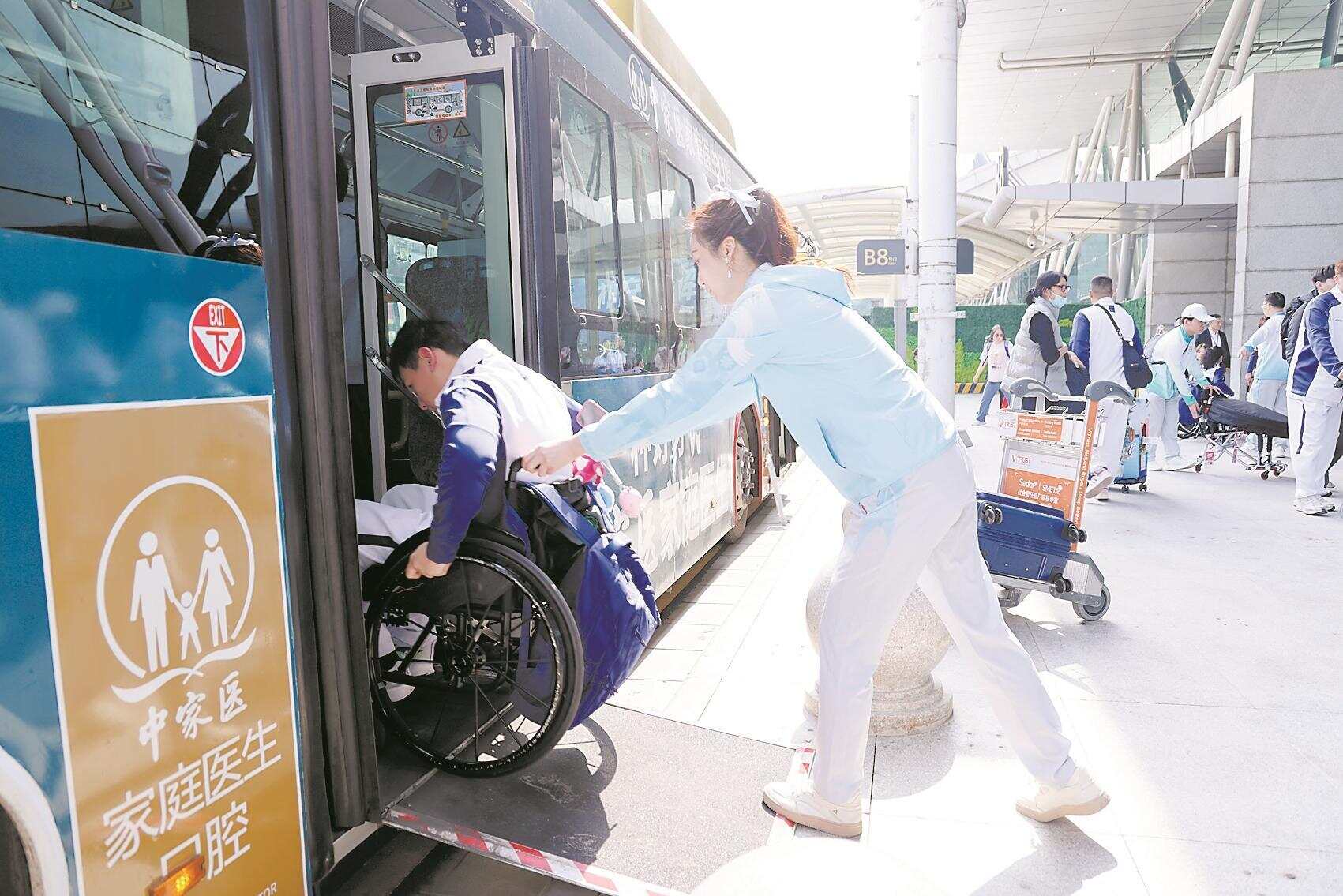 在航班落地后,志愿者提前30分钟抵达飞机廊桥口等候,手举“残特奥会接待”标识牌,为赛会来宾提供“点对点”引导服务。在值机、安检等关键区域开设赛事专属服务设施,保障团队安排专人协助办理托运手续,对使用轮椅或辅助器具的赛会来宾实施人性化检查,最大限度保护赛会来宾的隐私与权益。行李转运过程中,团队成员协助核对行李信息,确保赛会来宾的个人物品和比赛装备完好无损。从机舱门到大巴门的每一段路程,都饱含着团队的耐心陪伴。