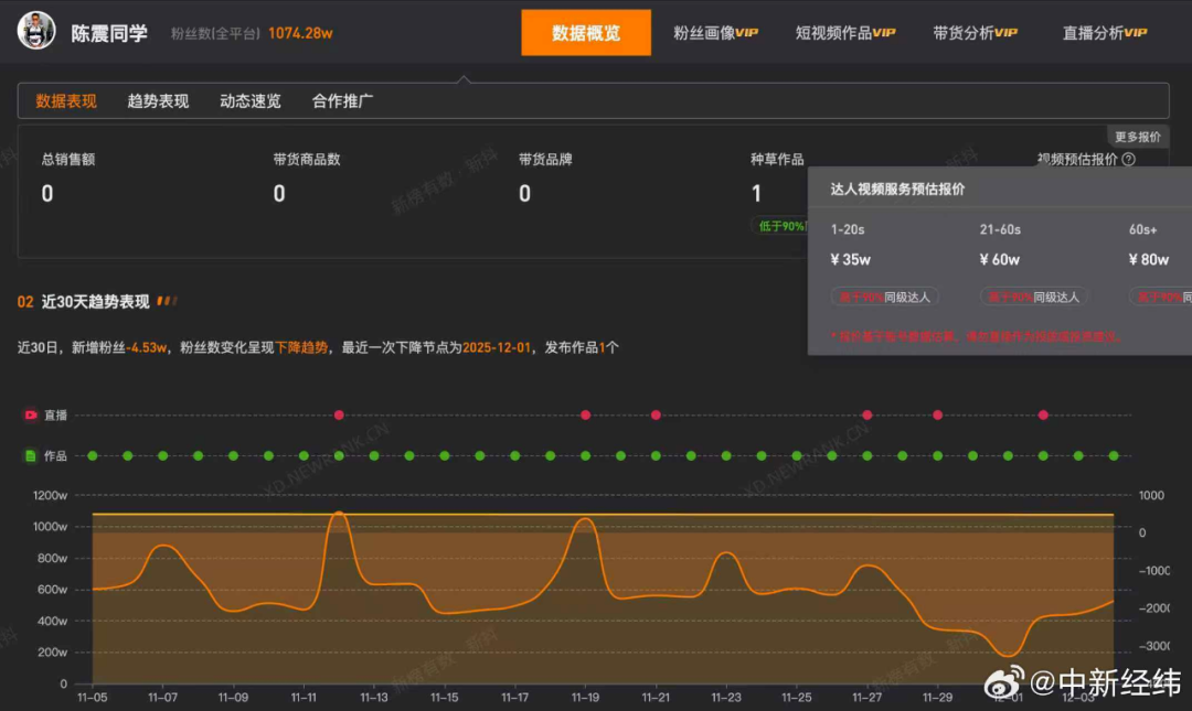 第三方数据显示,“陈震同学”视频平台近30日掉粉4.53万。此外,其1秒-20秒视频广告报价为35万,21秒-60秒视频广告报价为60万,60秒以上视频广告报价为80万。
