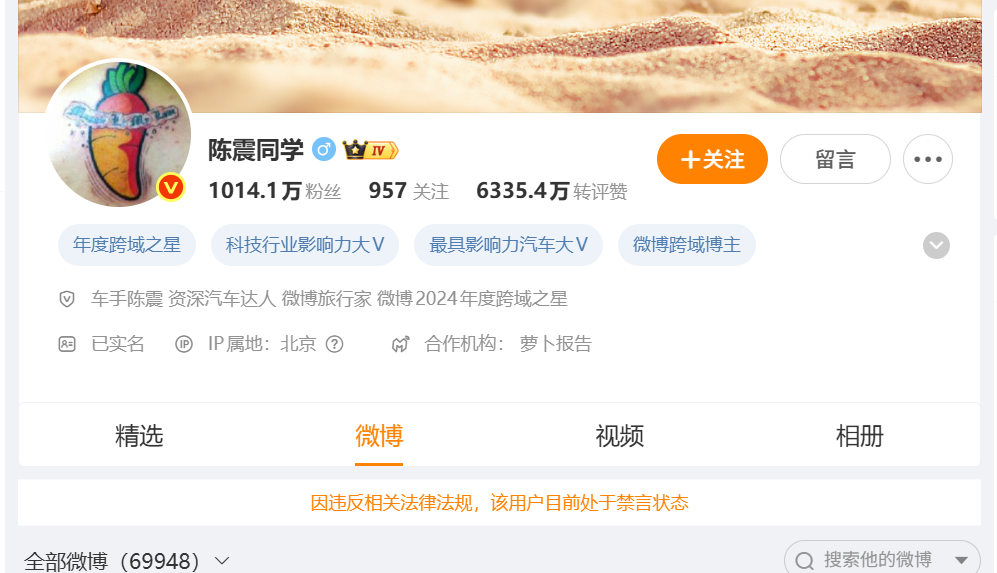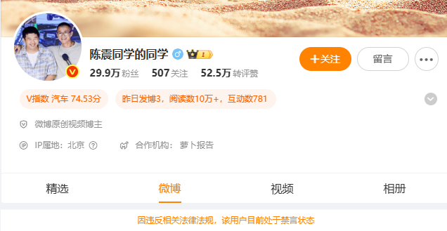 微博、抖音、小红书、B站等多平台显示,知名车评人陈震的账号因违反相关法律法规和政策,已被禁言。