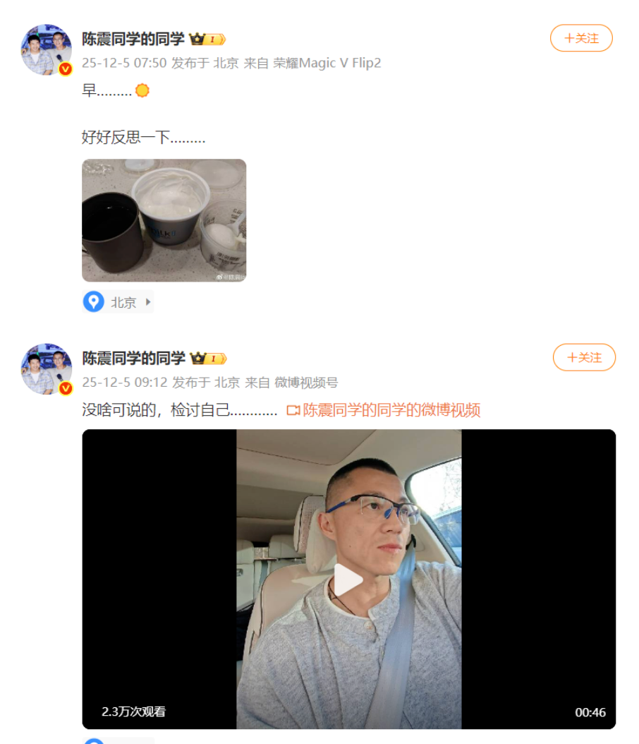 记者查询发现,该视频发布后不久已隐藏不可见。另一条文字反思的微博暂未删除。截至发稿,记者再次查看陈震小号,发现其已被禁言。