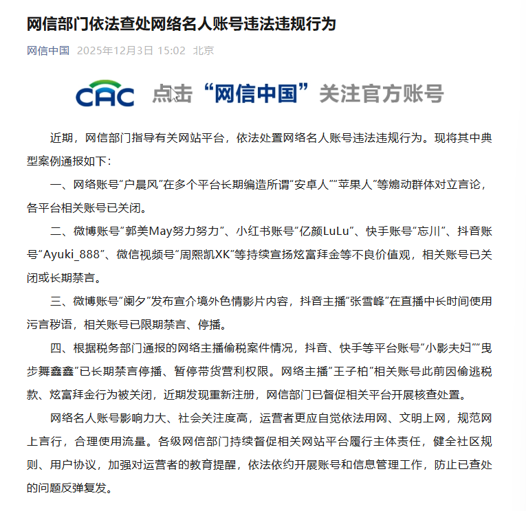 近期,网信部门指导有关网站平台,依法处置网络名人账号违法违规行为。通报的典型案例中,除了污言秽语者,还有煽动群体对立者,有宣扬炫富拜金等不良价值观者,有发布宣介境外色情影片内容者,等等。