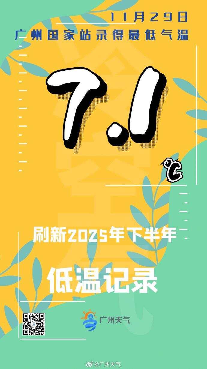 广州方面,11月29日,广州再次刷新下半年最低气温纪录!受到辐射降温影响,广州国家站昨日录得最低气温7.1℃,刷新了11月19日的最低气温纪录(10.5℃)。