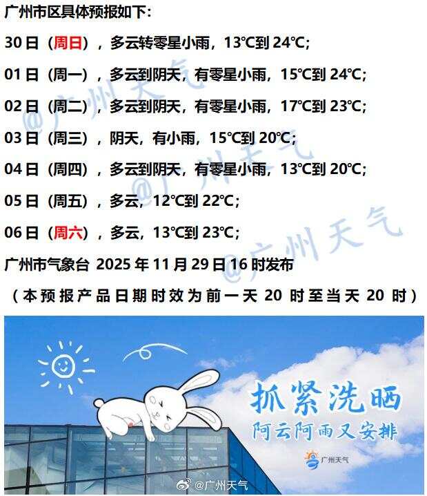 广东方面,预计30日-12月2日,广东省转多云到阴天,部分市县有小雨,早晨最低气温明显回升。具体预报: