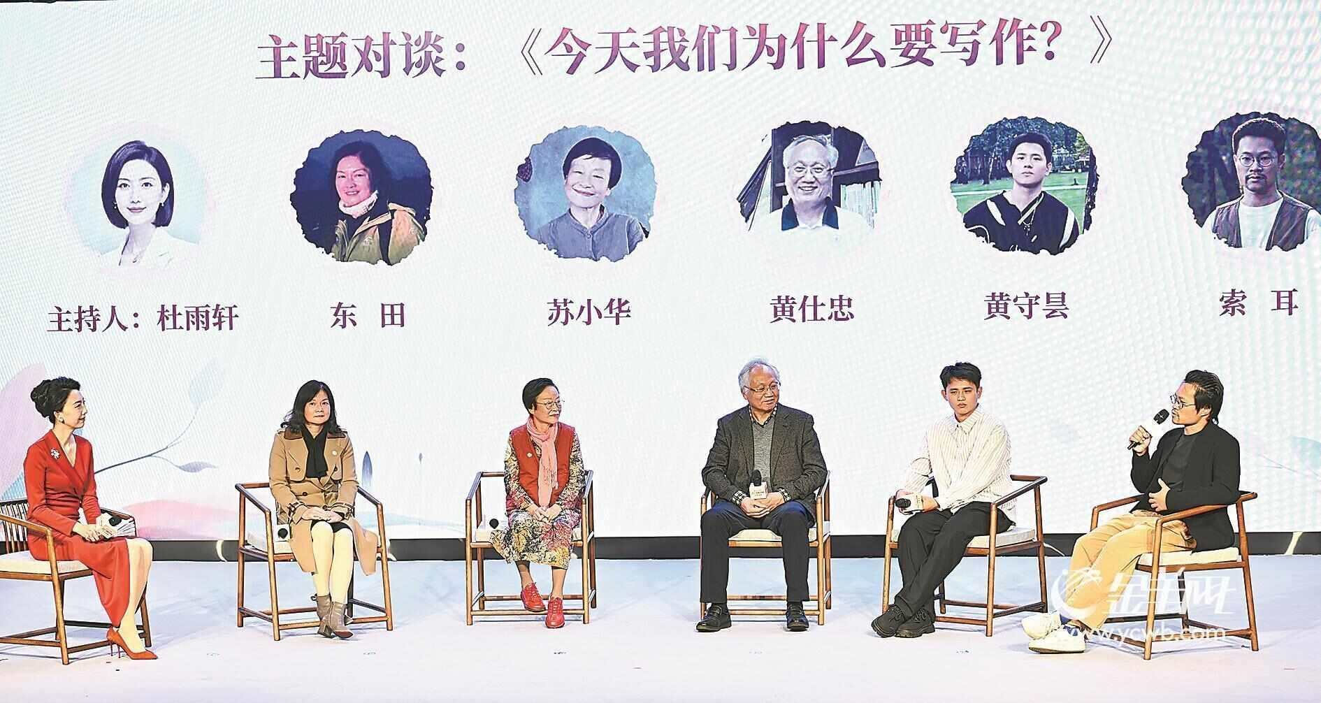 在新媒体时代,随着数字技术的普及,作为文学创作实践形式的写作,其边界与意义正悄然改变。今天我们为何还要写作?新大众文艺的蓬勃发展,给传统写作带来了怎样的影响?活动现场,2025花地文学榜“年度花地精品”的五位得主围绕“今天我们为什么还要写作?”展开主题对谈。来自艺术界的苏小华、教育界的黄仕忠、文旅界的东田以及青年写作者黄守昙、索耳从自身创作经历出发,共话在AI时代坚守写作的意义。