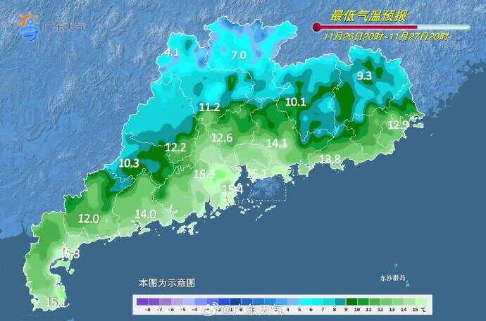 28日,广东省大部晴天。最低气温:粤北、肇庆和云浮市县3~8℃,部分市县有霜冻,南部沿海市县11~14℃,其余市县8~11℃。