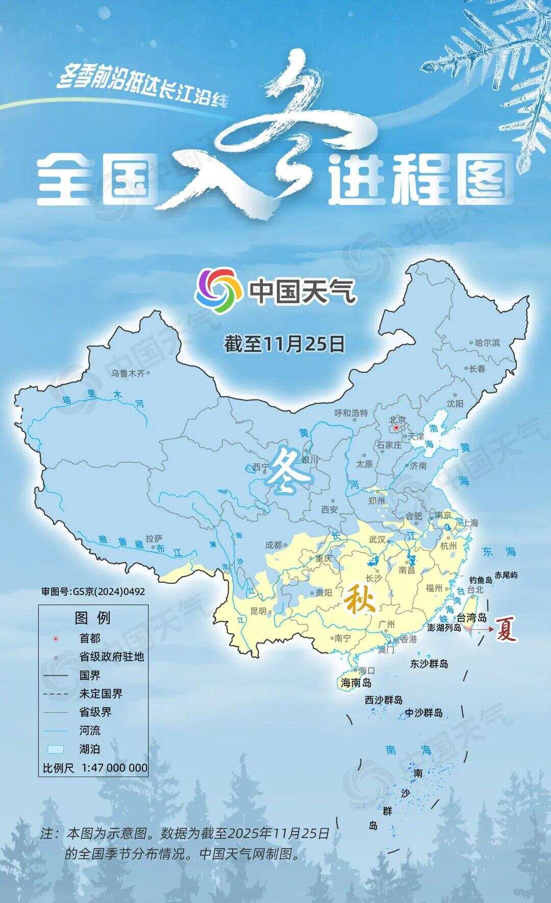 从最新全国入冬进程图来看,截至11月25日,冬季前沿已抵达长江沿线附近,江苏南部、安徽南部、湖北西南部、重庆东南部、贵州西北部、云南东北部部分地区已经入冬,冬季版图超过一半国土面积。湖南、江西、浙江、广西、广东、福建等大部地区依然处于秋天。