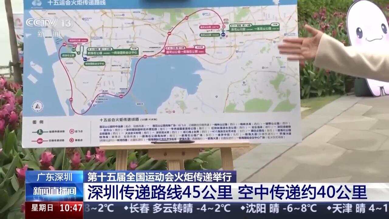 总台记者 陈丽:我现在在深圳的前海石公园,这里进行的是深圳火炬传递的第11棒到第16棒。深圳火炬传递路线全长45公里,其中地面跑动约5公里,空中直升机传递约40公里,整体设计紧扣深圳经济特区成立45周年的主题。传递全程分为三段,立体呈现深圳的发展脉络。