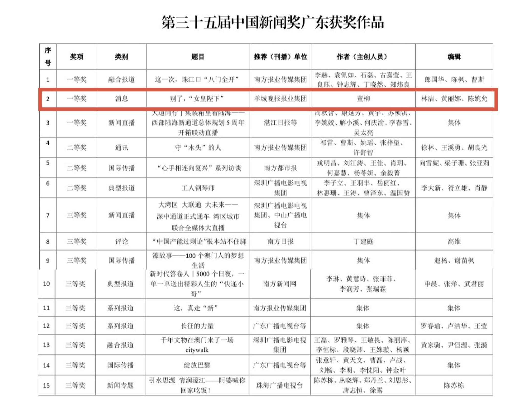 据悉,过去一年广东省新闻舆论工作取得丰硕成果。在第35届中国新闻奖评选中,广东省15件作品获奖,包括一等奖3件、二等奖3件、三等奖9件,创历史最好成绩。其中,羊城晚报报业集团消息《别了,“女皇陛下”》获评第35届中国新闻奖一等奖。在全国新闻界第十二届“好记者讲好故事”活动中,羊城晚报报业集团的沈婷婷、高镛舒等7位记者获“优秀选手”称号。