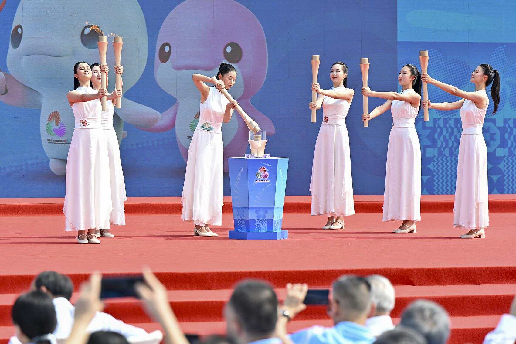 2.展演内容:体育薪火加油站。以本届十五运会与残特奥会的吉祥物“喜洋洋”和“乐融融”为代表与传奇火炬手接力传递,彰显广州“体育名城”的深厚底蕴。并以啦啦操热烈舞蹈为氛围依托,打造全民参与,共同欢庆的热烈氛围。
