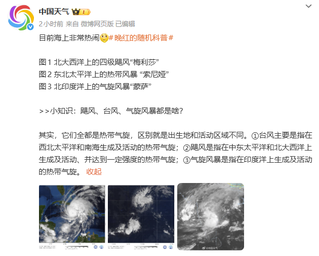 目前海上非常热闹,北大西洋上的四级飓风“梅利莎”、东北太平洋上的热带风暴 “索尼娅”以及北印度洋上的气旋风暴“蒙萨”在海上共舞。