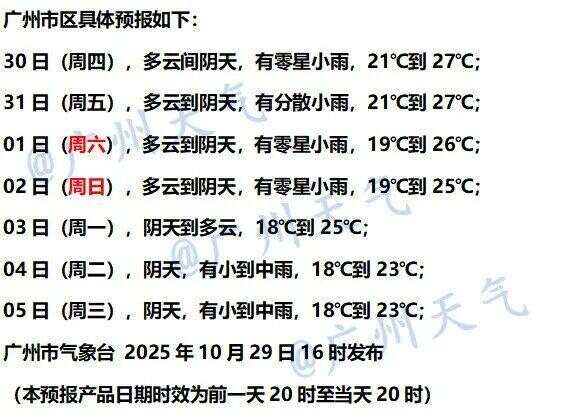 10月31日,粤北、粤西和珠江三角洲大部市县阴天间多云,有分散性零星小雨,其余市县多云到阴天,局部有小雨。最低气温:粤西、粤东和珠江三角洲市县20~23℃,其余市县17~20℃。