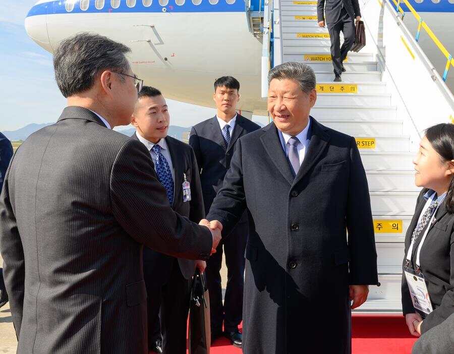 习近平抵达釜山金海国际机场时,韩国外长赵显等高级官员热情迎接。礼兵分列红地毯两侧致敬,军乐团演奏行进乐,机场鸣放21响礼炮。