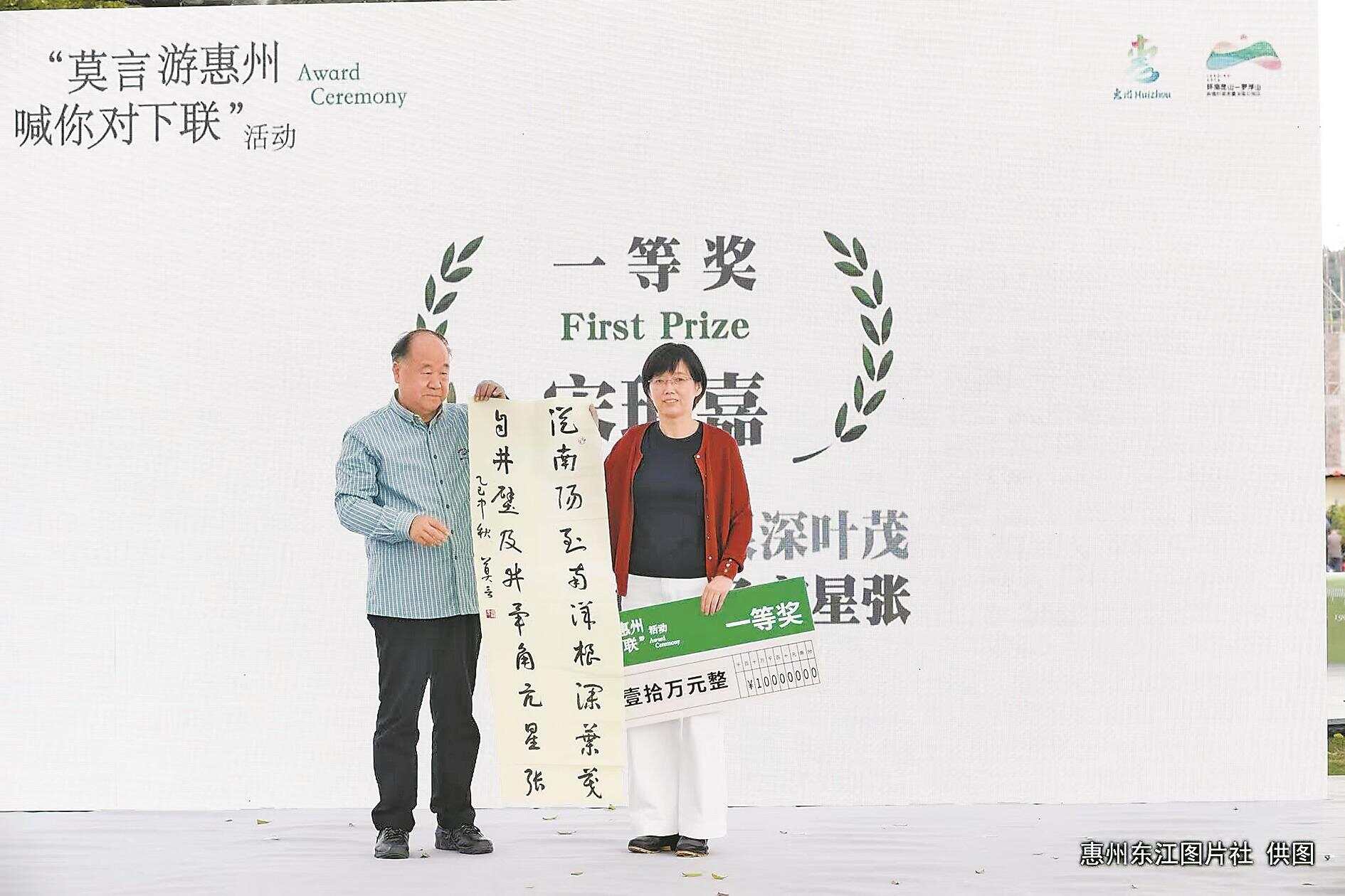 羊城晚报全媒体记者李海婵摄影报道:今年6月,诺贝尔文学奖得主莫言在惠州参观百年客家围屋碧滟楼时,有感而发,写下“从南阳到南洋根深叶茂”十个字作为上联,并向广大文学爱好者公开征集下联。10月20日,在环南昆山—罗浮山引领区主题采风活动及古榕文学村系列活动中,“莫言游惠州,喊你对下联”征集结果正式揭晓。来自北京的21岁研究生宋珂嘉所对的下联“自井壁及井毕角亢星张”,获一等奖,并得到专家高度评价。