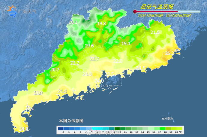 20日,粤东、珠三角南部沿海市县有阵雨局部大雨,其余市县多云,有分散阵雨。最低气温:粤北、肇庆北部、云浮西北部市县17~20℃,南部沿海市县24~26℃,其余市县20~24℃。