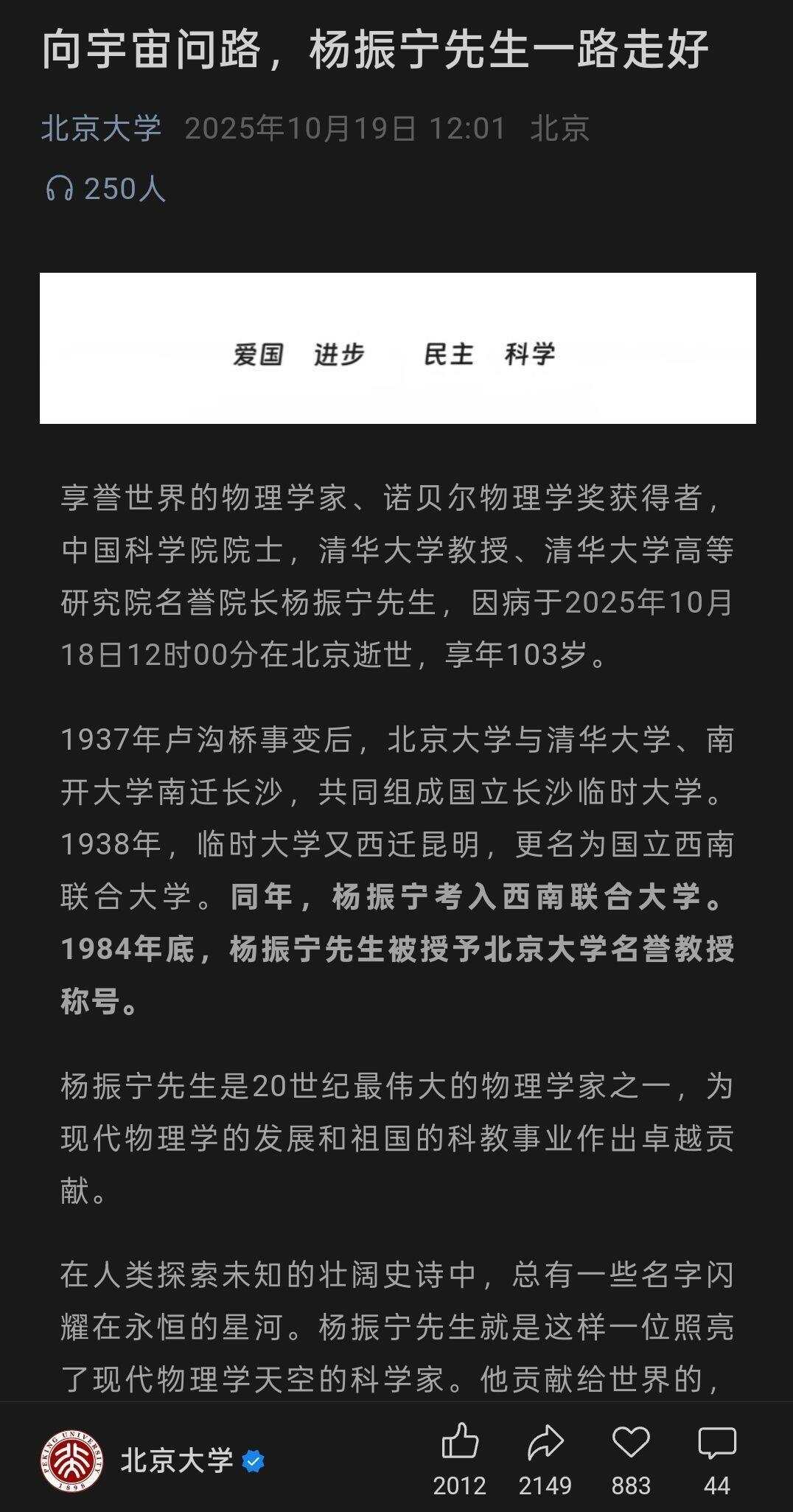 北京大学:向宇宙问路,杨振宁先生一路走好