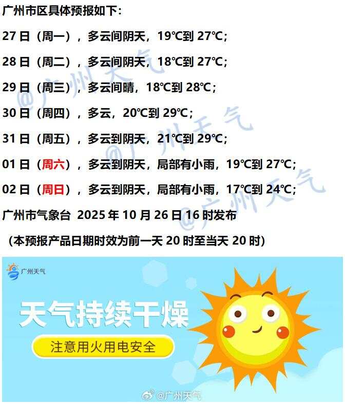 广州方面,未来一周天气干燥,早晚依然清凉。Sunny哥摸鱼,大件物品晾晒时间要久一些。昼夜温差较大,大家注意适时添减衣被,谨防感冒。