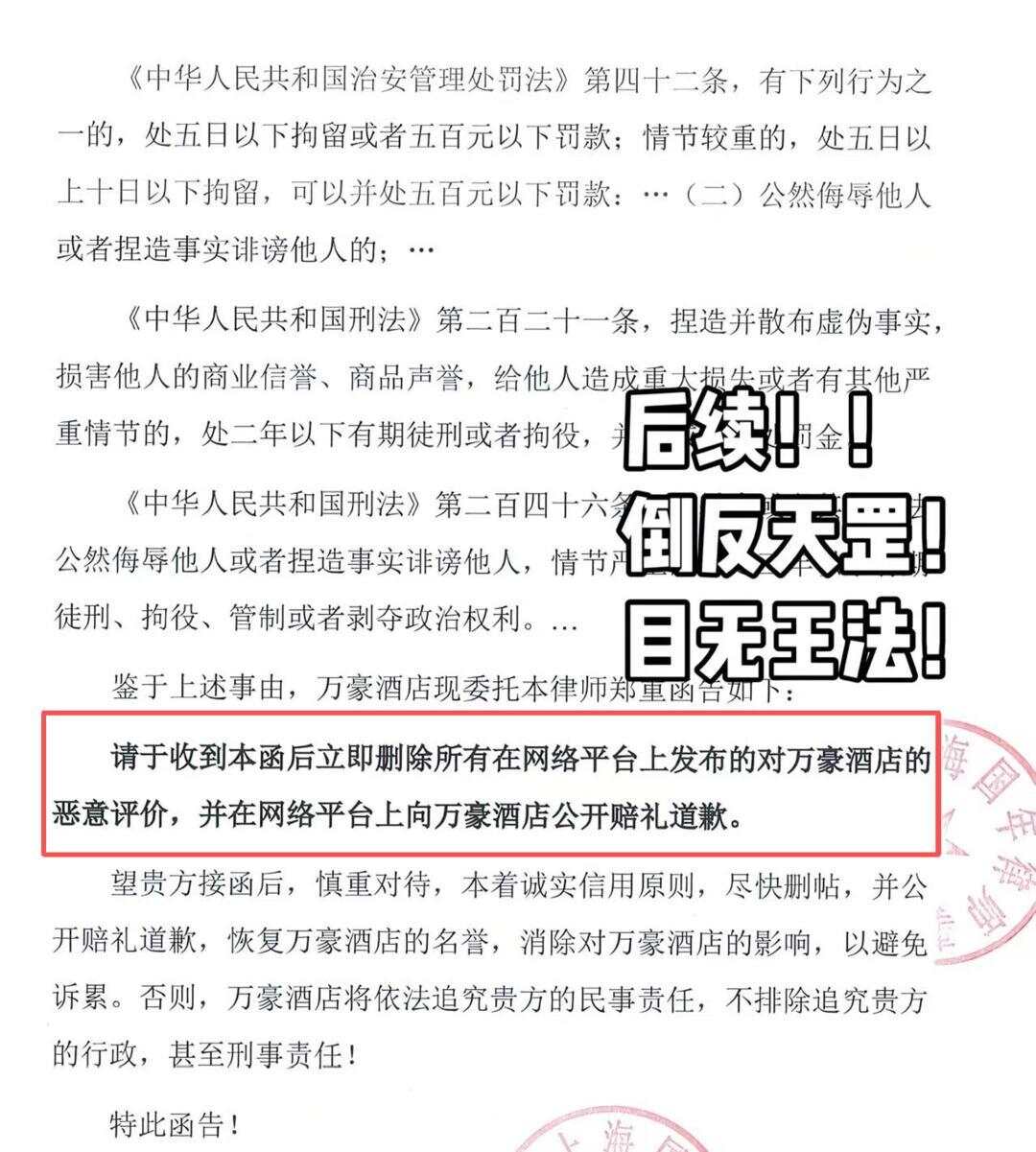 10月22日,该网友再度发布视频更新事件进展,称收到上海中优城市万豪酒店发送的律师函。酒店方提出,对于网友和其朋友在大众点评上的不实恶意评论,要求发布者限期删除。律师函中写到:请于收到本函后立即删除所有在网络平台上发布的对万豪酒店的恶意评价,并在网络平台上向万豪酒店公开赔礼道歉。