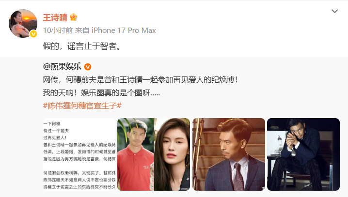 对此,与纪焕博一同参加《再见爱人3》的嘉宾王诗晴在个人社交平台发文辟谣,直言“假的,谣言止于智者”。