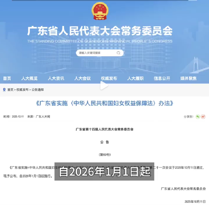 10月11日,广东省第十四届人民代表大会常务委员会第二十一次会议通过《广东省实施<中华人民共和国妇女权益保障法>办法》自2026年1月1日起施行,其中第四十八条规定:夫妻一方持身份证结婚证等证明夫妻关系的有效证件,依法向不动产登记、车辆管理单位申请查询另一方财产状况的,有关单位应当受理并为其出具相应的书面材料。这也就意味着自2026年1月1日起,广东省内的夫妻可以互查对方名下的不动产和车辆。 (深圳卫视)
