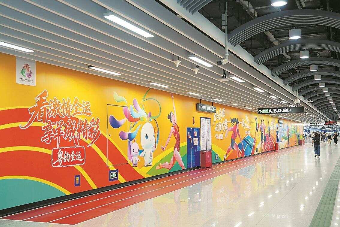 此外,广州地铁还在广州东站换乘通道同步推出“羊城八景”“食在广州”主题长卷,向旅客展示城市风光与美食文化;体育中心站出入口也已完成全运氛围布置,让市民从步入地铁起,即感受到扑面而来的全运热情。