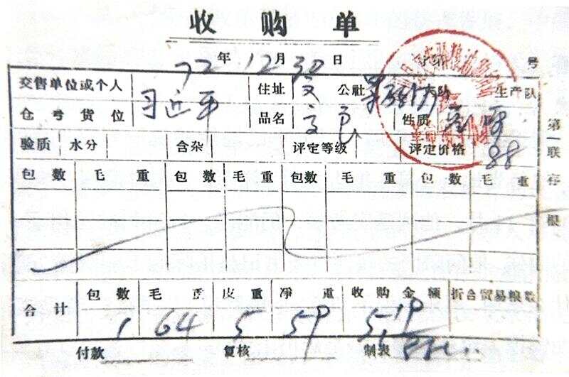 1972年12月30日,习近平交售了59斤公粮的收购单。