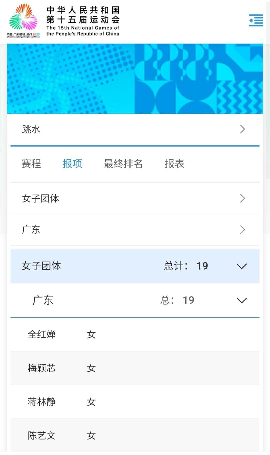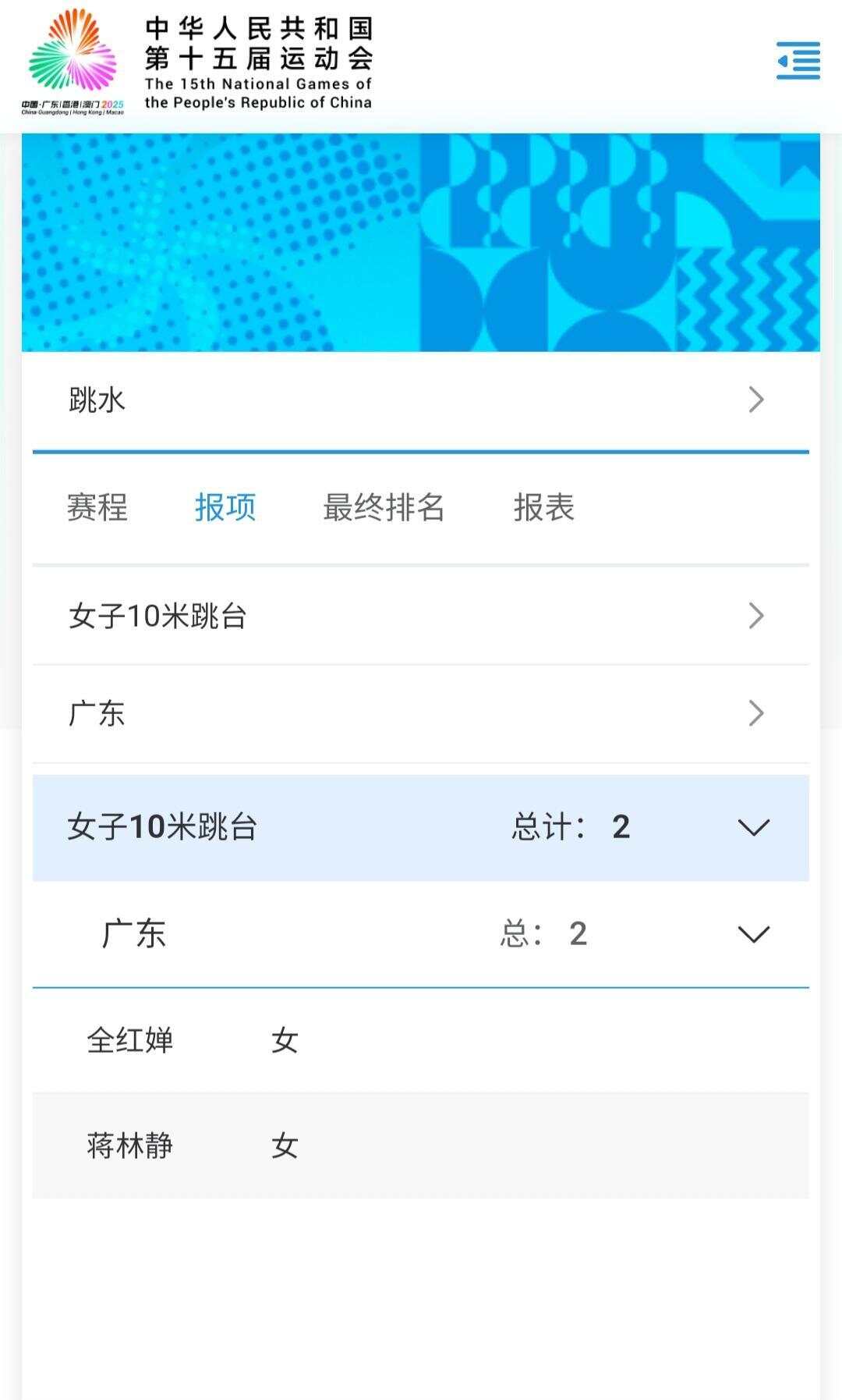 据第十五届全国运动会信息发布系统显示,已经5个月未参加正式比赛的两届奥运会跳水冠军全红婵出现在了十五运会广东省代表队跳水项目的名单中。系统显示,广东跳水队将参加十五运会跳水项目的全部14个小项,其中全红婵将出现在女子团体、女子双人10米台、女子10米台3个小项中。