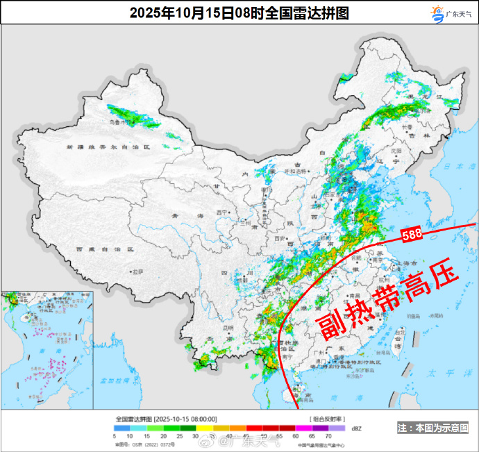 就广东而言,预计16日-18日,副热带高压依旧控制广东,因此广东大部以晴热天气为主,部分市县有阵雨或雷阵雨。